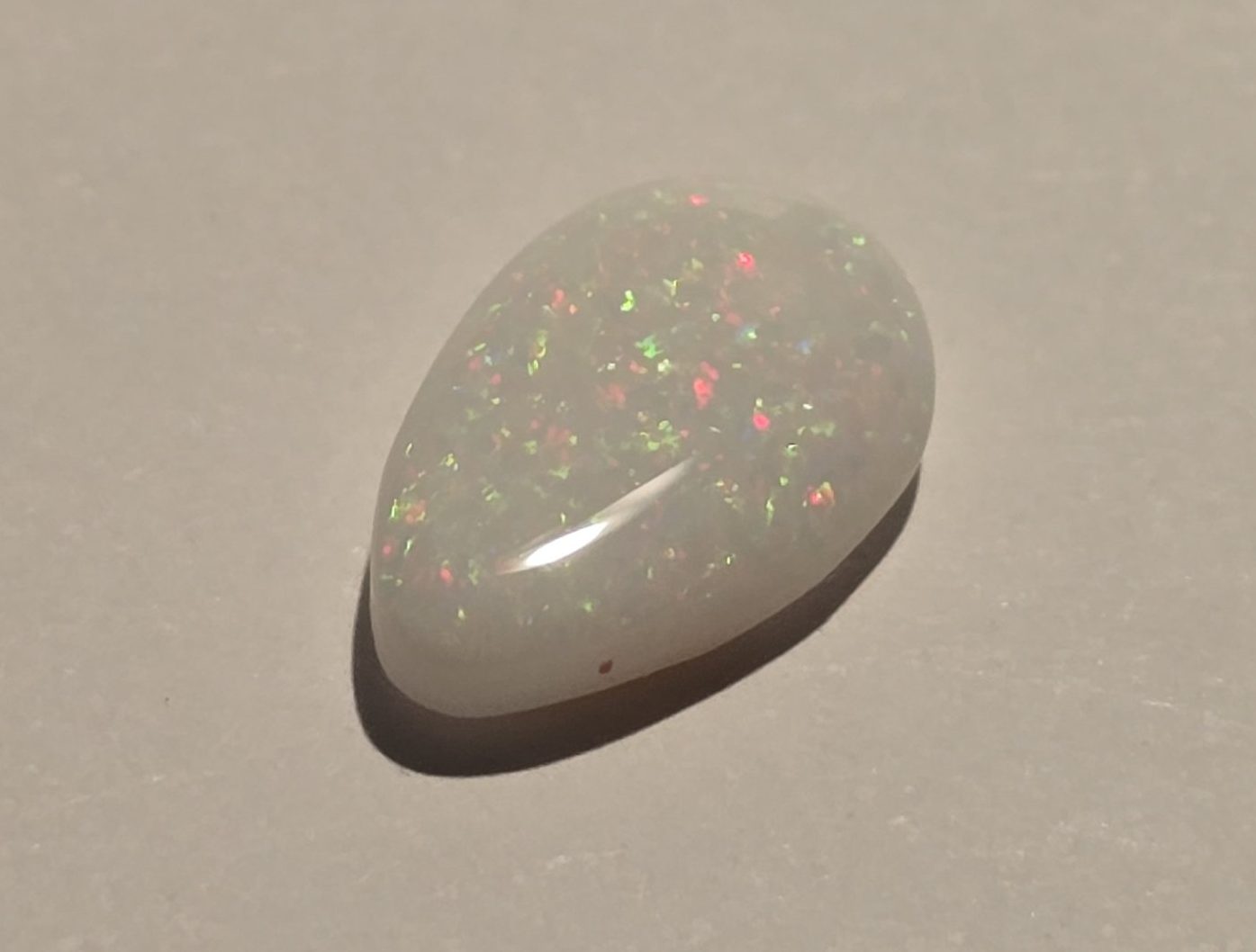 When moved under light, a fine white opal reveals delicate flashes of red, green, blue, and gold, giving the stone a dreamy, ethereal glow. Its calm and elegant appearance makes it one of the most versatile opals for everyday wear and classic jewellery designs.
